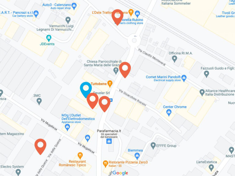 La sede di Develer è in una zona molto facile da raggiungere con tutti i mezzi, pubblici e privati: